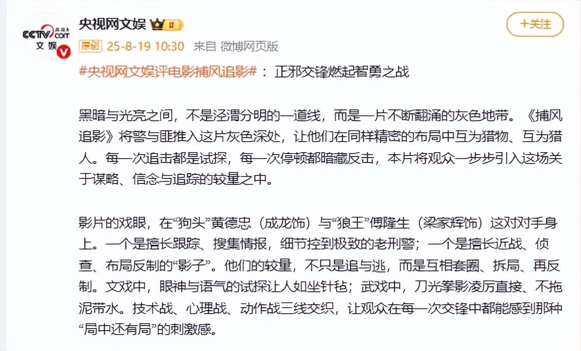 央视网娱乐也对《捕风追影》进行了点评,一篇近千字的指摘,字字句句说念出不雅众心声。