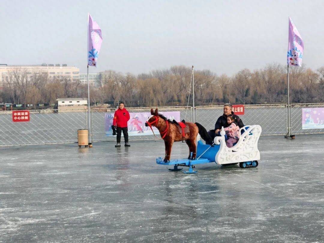 记者在玉渊潭公园看到,位于公园东湖南岸的冰风光积额外开阔,以东湖南船埠为界离别为东、西两区,1400辆各样冰上文娱尺度温情不同庚级段的搭客需求。其中西区主打经典冰上表情,既有传统的冰车与冰上自行车,也有让孩子们欢欣若狂的“雷霆战车”;东区除了传统冰车除外,还增添了卡通电动冰车、憨态可掬的狗拉雪橇冰车,以及稀零为马年推出的马拉冰车等。