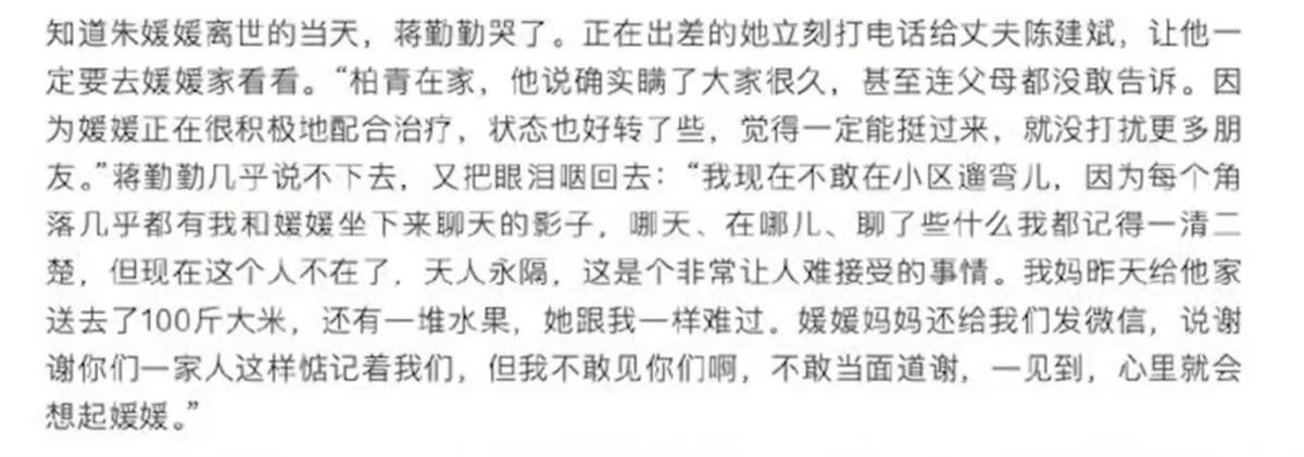 既是邻居又是好友的蒋勤勤,在说起朱媛媛时仍忍不住落泪,而算作家东谈主的辛柏青,情况更为千里重。