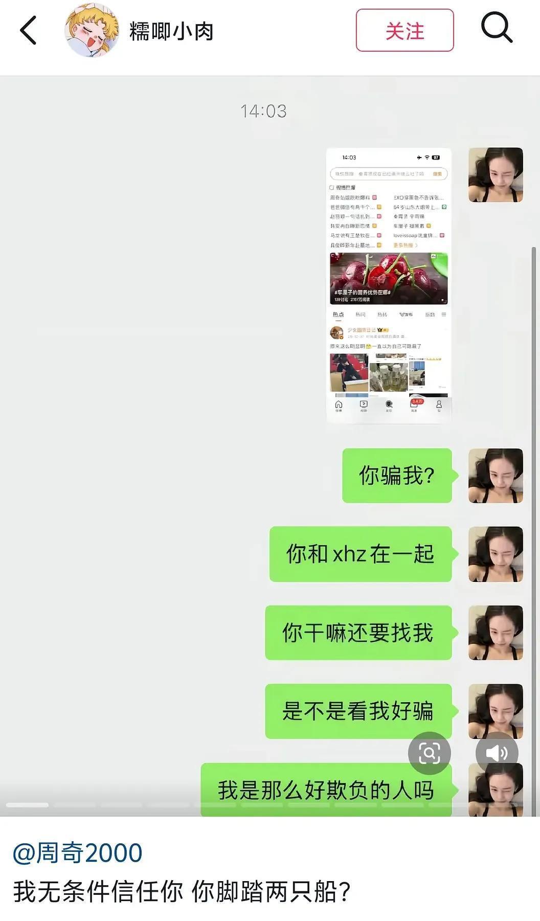 公开在社媒艾特周奇对线,叱咤他亏负了我方的信任,训斥他为何脚踏两条船。同期,还晒出了部分聊天纪录,喊话周奇“你和向涵之在沿路,你干嘛还要找我。”痛批男方应用她。对方均无回话。