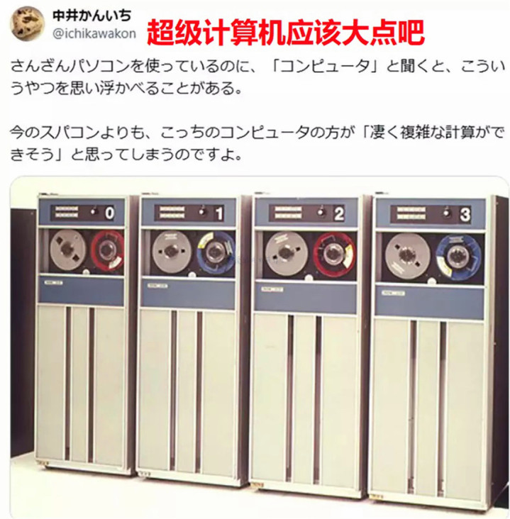 环球且听博士渐渐谈来。一驱动,一位社群ID为“ichikawakon”的网友发文默示:诚然我平日皆在用电脑,但每次听到Computer这个词汇的时候,脑海里照旧会骄横出一种印象。总以为比起当今的所谓“超等电脑”,往日的老电脑反而更像是能作念出“超等复杂计较”的东西啊!而在他的配图中,四台繁多的机器跃入眼中,每台机器皆有两个大“圆盘”。