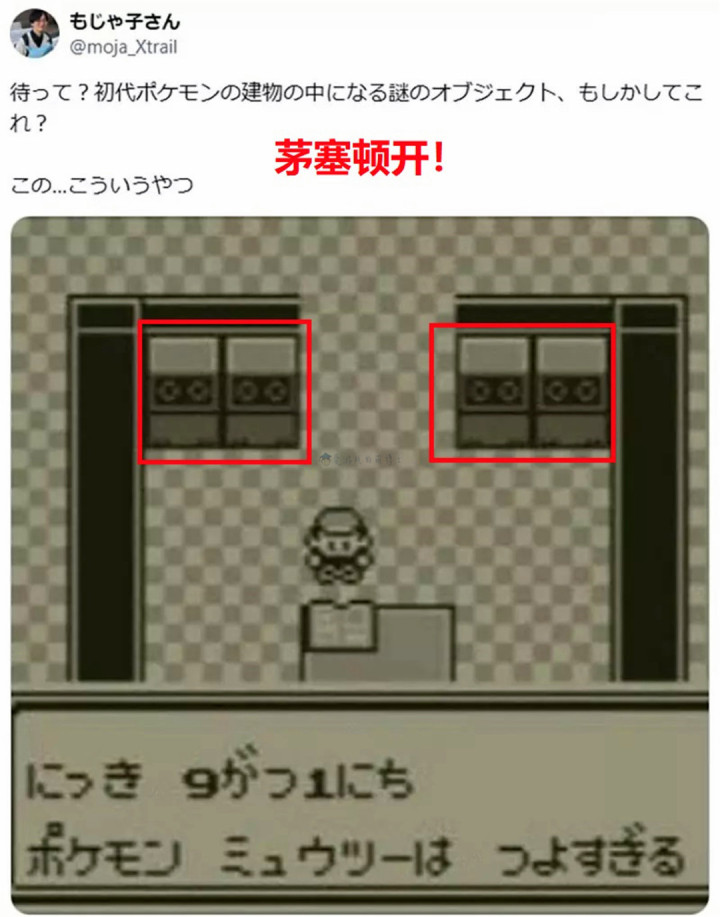 真谛的是:“ichikawakon”的贴文被另外一位网友“もじゃ子さん(社群ID为moja_Xtrail)”看到了,后者惊觉:“等一下?是以初代《宝可梦》建筑物里摆放的阿谁玄机物体,该不会即是你们讲的老电脑吧”?配图是《宝可梦》初代游戏(1996年推出)的截图,内部那四台机器简直和上头共享出来的使用磁带存储器的古董电脑一模同样!有计划到其时游戏开导东谈主员的年级以及家具天下不雅布景,场景里有他们熟练的老电脑莫得任何问题。