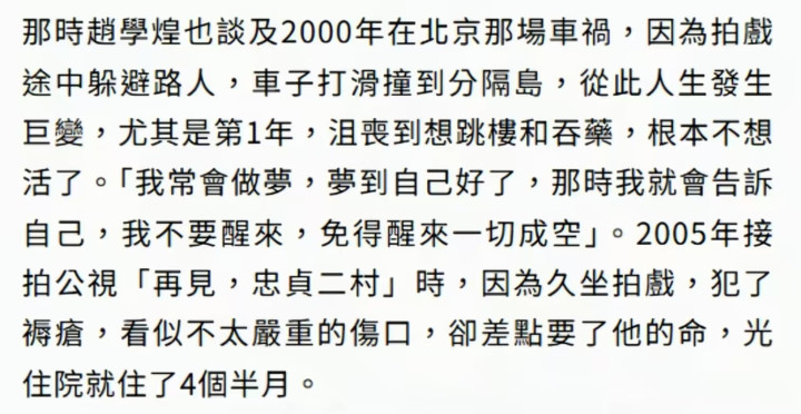 2000年5月底6月初,赵学煌到北京洽谈新戏,返程途中为了避开开东谈主,轮胎打滑,发生车祸,尽管被关键送往病院抢救,命捡了追念,但下半身瘫痪,再也无法步辇儿。
