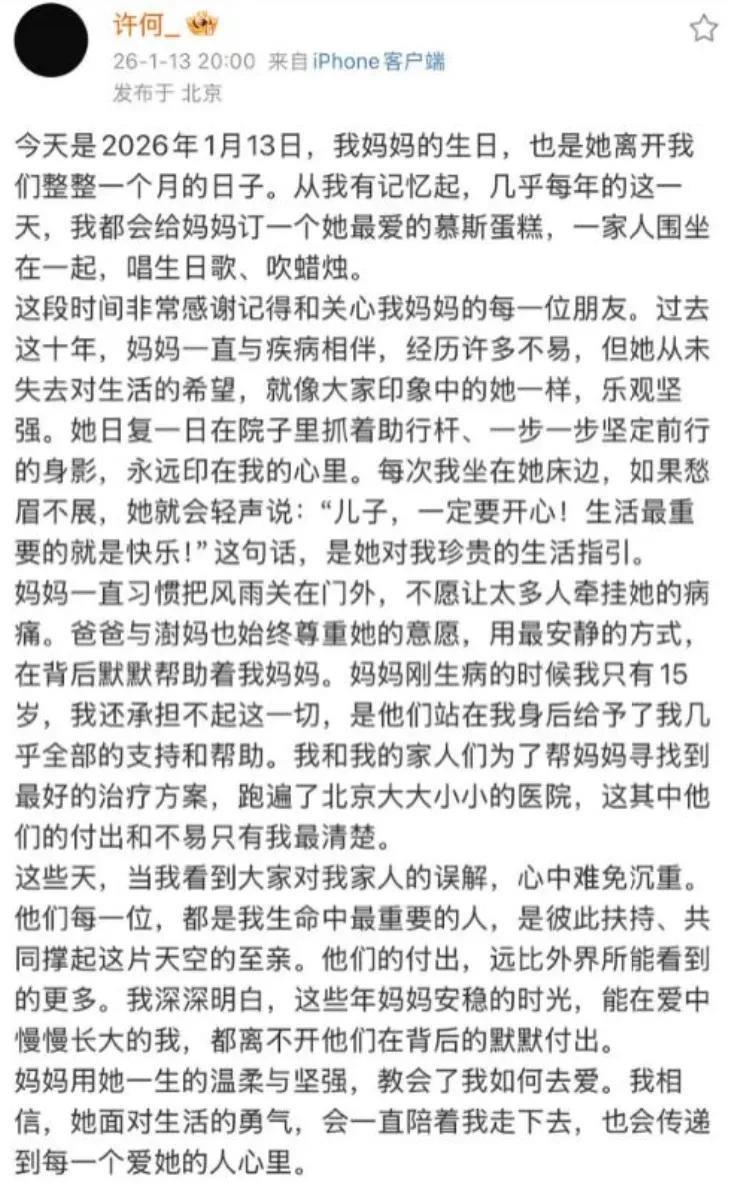 2026年1月13日,演员何晴之子许何发布了一篇诚笃的长文,顾忌这位被誉为“古典第一好意思女”的母亲。