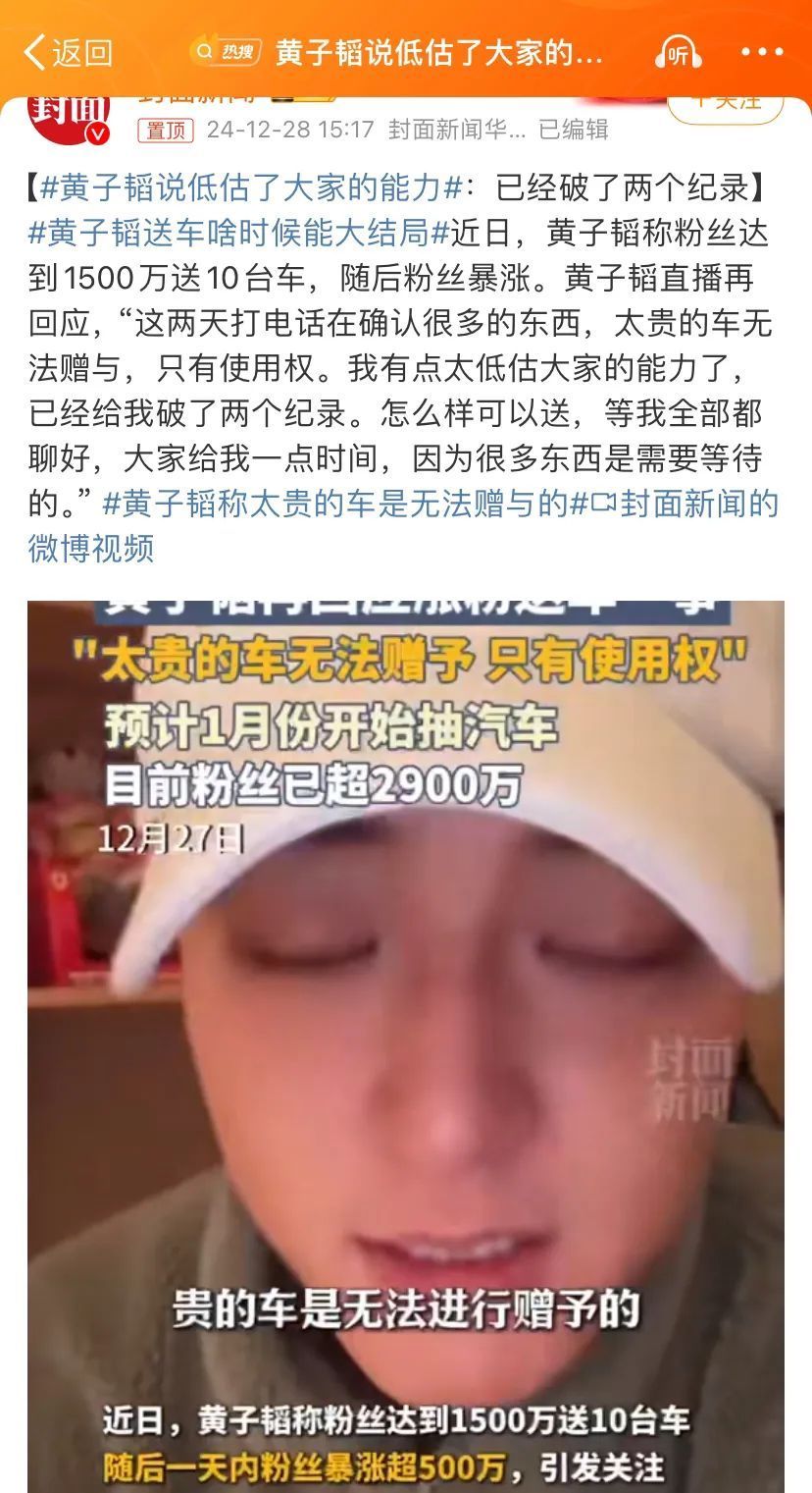 哈哈,他可能随口说送车,为止这个恶果,那就只可真送了。他在直播时说:“低估了粉丝的能力,太贵的车无法赠予,唯有使用权……”