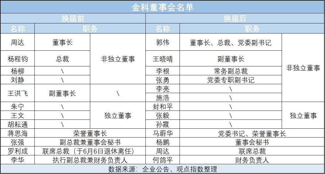 今日晚上,该公司一次性发布了8条公告,大部分王人跟董事会辩论,当中厚爱线路了新一届调调班子名单,包括郭伟获任金科股份董事长、总裁、党委副文书,王晓晴任副董事长,周达为联席总裁,李根为常务副总裁,张勇为党委专职副文书,杨鹏为董事会秘书,何鸽平为财务负责东说念主。